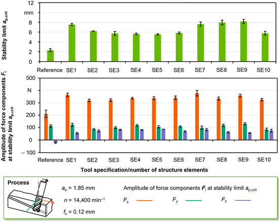 Figure 13 provides an overview of the stability limits achieved in the present investigations. A technologically relevant range and a technologically irrelevant process range can be identified for the selected tooth feed rates. The second-mentioned tooth feed range for both tool specifications used (SE10 and reference) is characterized by stability limits achieved in the ramp milling tests, which are between 30 and 40 percent of the technologically relevant tooth feed range. Within the relevant tooth feed range, at a constant engagement width of ae = 1.85 mm, amplitudes of between 300 and 400 N occurred for the process-dominating force component in the Fx direction, when the stability limit was reached. In contrast, these force amplitudes occur in the milling processes in the technologically irrelevant tooth feed range with a factor of 2–2.5 or with maximum forces of approx. 830 N. This implies the conclusion that only a very limited lateral support effect is provided by the functional structure elements due to the excessive process forces.
