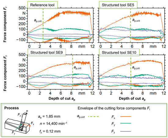 The analysis of the development of cutting force components in the ramp milling process supports the basic assumption that the increase in structure elements has a stabilizing effect on the process. Two effects can be seen from the results in Figure 10 with regard to the FX cutting force components. On the one hand, there is a flatter and almost linear gradient until the unstable process part is reached in the case of structured tools compared to the reference process. On the other hand, the corresponding gradient in the reference process has a more degressive gradient. The slower increase in force could be an indicator that lateral forces are actually absorbed by the functional elements by using the structured tools, thus enabling a shift in the stability limit to higher cutting depths. A second effect that could be identified relates to the fact that the signals of the FX cutting force components in the unstable part of the reference process are strongly superimposed by vibrations. This effect of vibration superimposition decreases significantly with an increase in the number of structure elements and almost disappears with the SE10 tool specification. Therefore, the stability limit of this tool configuration may be estimated to be higher than the results achieved in the ramp milling tests suggest.