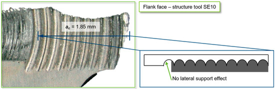 The decrease in the performance of Δap,crit = −2.42 mm compared to the tool specification of SE9 is probably a result of the fact that the lateral engagement width of ae = 1.85 mm in the milling process of the internal structure element, as illustrated in Figure 11, results in a one-sided load on the structure arc. As a result, a lower lateral support effect can be assumed. Based on this information, it can be concluded that in order to optimize the structure tool concept, not only should the design of the cutting edge shape but also the lateral engagement width ae be matched to the number and total width of the structure elements.