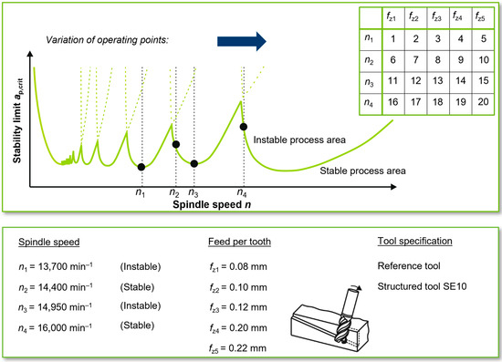 Scheme of the process stability lobe diagram and process parameter variation.
