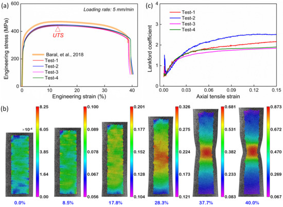 Figure 2. (a) Stress–strain curves obtained from four repeated tensile tests along RD. The tensile curve quoted from [45] is also superimposed for comparison. (b) DIC images showing the evolution of the axial strain distribution during tension. (c) Lankford coefficient curves derived from the DIC results.