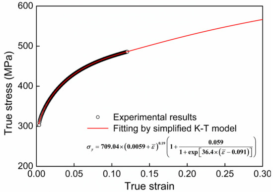 Figure 5. True stress–true strain curve (symbol) obtained by uniaxial tension in RD and the fitting/extrapolation results (solid line) by the simplified K-T model.