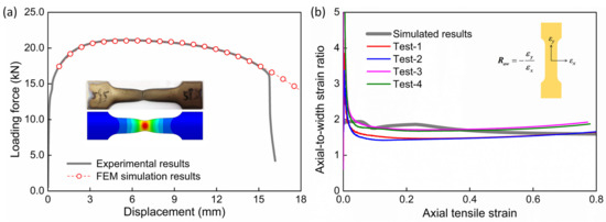The simulation of uniaxial tensile tests following the experimental procedure is carried out to verify the constitutive model. As demonstrated in Figure 6a, the model accurately captures the mechanical response, especially the post-necking behavior. Moreover, the strain ratio of the axial (εy) to transverse direction (εx) is extracted from the critical point located in the specimen center and compared to the experimental results measured with DIC, as shown in Figure 6b. The acceptable consistency indicates the availability of the proposed constitutive model.