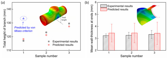 In addition to the uniaxial tension, various tube hydroforming processes are also simulated to evaluate the FEM model by applying the forming parameters tabulated in Table 2. As shown in Figure 7a, the total height of the tube branch is accurately predicted with remarkably small errors of only 1.0~1.6%. The good agreement indicates that the developed FEM model can be utilized in a wide range of processing conditions. Meanwhile, the von Mises yield criterion is also examined for comparison. As observed in Figure 7a, it predicts a much larger branch height for sample 1, with a deviation of ~14%. Meanwhile, the other two samples are even bursting under the von Mises criterion, which is totally inconsistent with the experiments. This, however, is anticipated, since the von Mises criterion ignores the distortional hardening effect such that the material becomes much too soft.