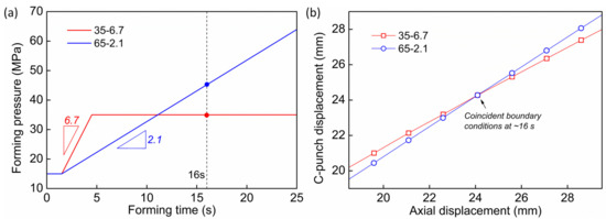 However, scheme 2 also faces the primary concern that it may be not a one-to-one mapping relation between the displacement field and the boundary condition. That is, there may be more than one displacement field corresponding to a certain boundary condition, so that it would be misleading when inferring the former from the latter by ML models. To examine this point, a series of FEM simulations have been performed by employing different pressurization paths as typically described in Figure 9a, whereas the axial feeding rates are identical (1.5 mm/s). Thereinto, the sample label, 35-6.7 or 65-2.1, means that the target pressure is 35 MPa (65 MPa) with a pressurization slope of 6.7 MPa/s (2.1 MPa/s). The obtained displacement boundaries of the two simulation runs are shown in Figure 9b, where the vertical axis denotes the passive displacement of the counterpressure punch, and the horizontal axis represents the axial feeding distance. Note that there exists an intersection point on the displacement curves, indicating that the boundary conditions are transiently coincident despite the fact that the loading paths are far from identical. As indicated in Figure 9a, the corresponding internal pressures at that point (~16 s) are 35 MPa and 45.4 MPa, respectively.