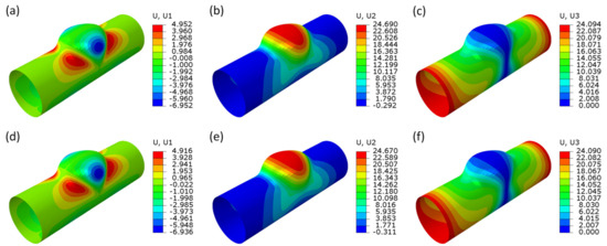Figure 10 shows the displacement fields of the two samples at the time point when the boundary conditions are coincident. One can note that the displacement field is nearly identical both in terms of distribution and gradient. The maximum deviation is only less than 1%. In a word, the deformation state of the tubular component at a certain time point can be well reflected by the concurrent boundary conditions. It should be mentioned that this observation is not a coincidence but has been demonstrated as a common phenomenon in the present case. Therefore, the one-to-one collocation between the displacement boundary condition and the displacement field is confirmed, as well as the reasonability and availability of the scheme 2. Further discussion with respect to this point will be carried out later.