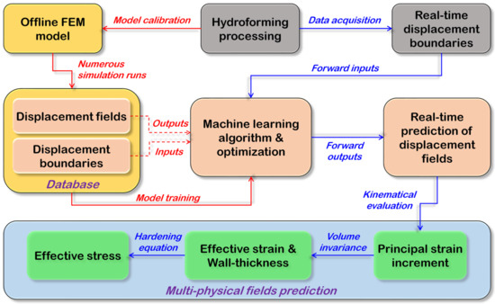 Based on the analysis above, the FEM-ML framework can be constructed for the present case. As schematically overviewed in Figure 11, the framework consists of three parts that are interrelated, i.e., the offline FEM, the physical part, and the ML-based surrogate model. Based on the hydroforming process, the offline FEM is calibrated and applied to generate the training database, which is accomplished by full-field simulations under various loading paths. Time series data with respect to the displacement boundaries and the displacement fields are extracted from the simulation output files. To balance the precision and the efficiency, the time interval for data collection is set to be 0.5 s during the entire forming process. Then, the database is used to train the ML model, in which the input data are the displacement boundary conditions, and the displacement fields are treated as output. After that, the real-time displacements of the counterpressure punch and the seal punch are acquired by the well-trained surrogate model. Once the input dataset is received, the surrogate model will instantly predict and visualize the coordinates of all nodes to show the current shape of the tube component. Meanwhile, the coordinate values are used to calculate the total principal strain by comparing them with those in the undeformed state. Thereby, the concurrent equivalent strain, the current wall-thickness, and the effective stress are derived simultaneously and contour-plotted on the pseudo-integration points.