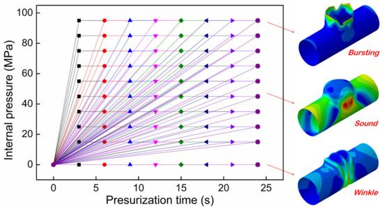 A well-organized database is the basis for the efficient training of the ML model. As emphasized earlier, the deformation state of the tubular component is up to the relative displacement/velocity of the counterpressure punch and the seal punch. Hence, a fixed feeding rate of 1.5 mm/s is utilized for the seal punch in all the simulation runs, while the pressurization curve is changed in a wide range to introduce differences in the free boundary. For that, a parameter grid is created, as seen in Figure 12, which roughly covers the capability of the hydraulic forming facility and various forming defects from wrinkling to bursting. The produced database consists of the two displacement boundaries, the nodal number, and the three coordinate values for each node. Because of the occurrence of bursting under ultrahigh internal pressure, some of the time series data are incomplete. The obtained database for ML training has more than 2.4 million lines of data generated from 73 FEM simulation runs.