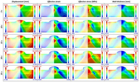 According to the analysis above, the field variables during hydroforming are sequentially derived through simple algebraic calculations on nodal coordinates. Again, it should be stressed that the elastic deformation is ignored in the computational sequence to evade time-consuming iterative calculations, enabling the extraction of the plastic strain from the total strain. However, it has little effect on the accuracy of the field variables because the elastic deformation is negligible in such a hydroforming process. On the other hand, the displacement field has already been predefined according to our methodology, which can minimize the elastic effect on the deformation.