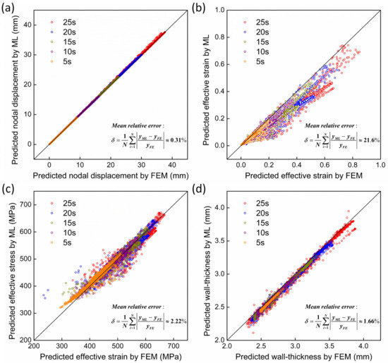 Figure 15. Quantitative comparison of the predicted field variables between ML model and offline FEM model for all nodes/elements at various forming times: (a) displacement of nodes; (b) effective strain of elements; (c) effective stress of elements; (d) wall thickness. The mean error is also tabulated in the figure, where yML and yFE are the predicted results by ML model and FEM model, respectively.
