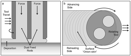 (a) Side-view diagram of the twin-rod AFSD process. (b) Top-down-view diagram of the AFSD process. The tool is moving from left to right and rotating in a clockwise direction.