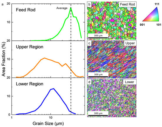 (a) Grain size distributions for the feed material, upper region, and lower region of the deposit. The average grain size of the feed material is annotated by a dashed line to highlight grain refinement in the deposited material. (b–d) Inverse pole figure maps gathered via EBSD for the feed rod material, upper region, and lower region of the deposit, respectively.