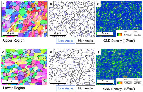(a) High-magnification IPF map, (b) grain-boundary-type plot, and (c) GND map of the upper region. (d) High-magnification IPF map, (e) grain-boundary-type plot, and (f) GND map of the lower region.