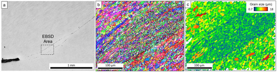 A section of material from the trial 8 AFSD deposit was prepared for microscopy, as shown in Figure 2b–d. The initial optical imaging of this cross-section, shown in Figure 2c, revealed physical features running roughly diagonally across the cross-section, which are redrawn for clarity in Figure 2d. The most prominent of these features is a pair of large, flat, elongated pores on the lower left side of the image. The other main feature is a boundary or “crease” running diagonally across the image. The presence of such distinct features is unusual for AFSD deposits and may be a sign of the lack of sustained deposition achieved during the trials. Near the center of Figure 2c, this boundary is very clearly defined but is less apparent at the edges of the cross-section. Figure 2d shows the apparent path of the boundary based on observed features, such as small aligned pores and the surface topography. Here, S1, S2, and S3 represent the sample directions necessary for crystallographic-orientation-based characterization. The deposit was sectioned based on where sufficient material was available to produce tensile test bars, so the cross-section did not align directly with any process directions (i.e., the working direction, transverse direction, and normal direction). The long axis (S2) of the tensile bars was approximately 45° off-parallel from the process working direction.