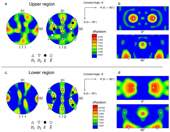 Pole figures and orientation distribution functions for the (a,b) upper region of the deposit and the (c,d) lower region of the deposit. Specified xRandom scales apply to both the PF and ODF for the region.