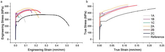 (a) Engineering stress–strain plots and (b) true stress–strain plots for the AFSD-deposited Ta2.5W alongside those for a reference sample sectioned from the annealed Ta2.5W plate material.
