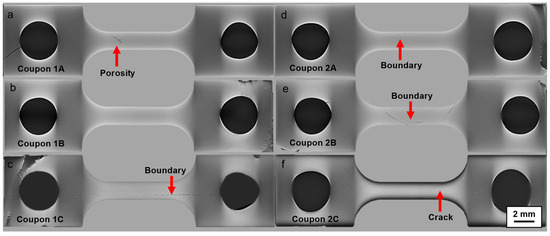 (a–f) XCT slices highlighting observed defects and physical features for coupons 1A, 1B, 1C, 2A, 2B, and 2C, respectively.