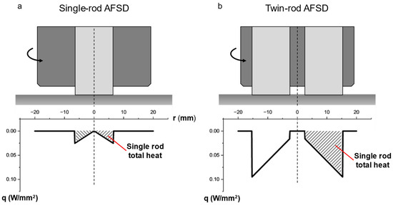 Nominal heat generation calculated as a function of the radial position from the center of the tool for (a) single-rod AFSD and (b) twin-rod-style AFSD.