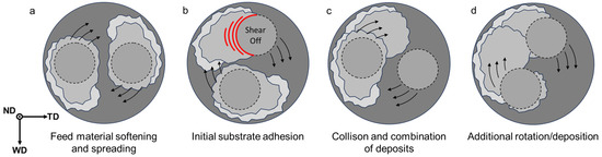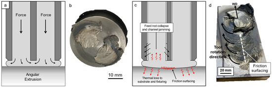 (a–d) Proposed sequence of feed rod softening, substrate adhesion, and buildup of material during twin-rod-style AFSD.