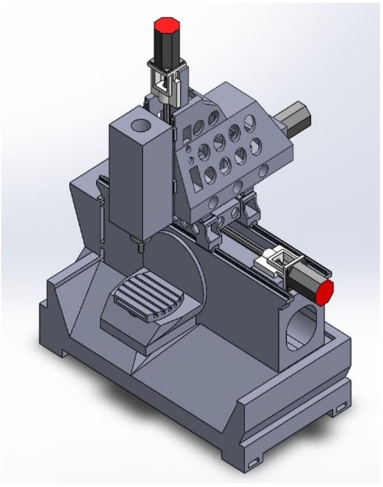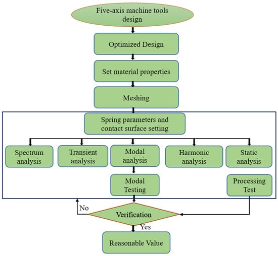 As far as we are aware, Yutian et al. [1] presented the design and development of a five-axis machine tool for aero-engine casing manufacturing. Machine tool development has always aimed for increased efficiency and precision, and some successful studies have been conducted in this area by academics. For example, there have been studies on geometric error modeling, identification and compensation [2,3,4], thermal error prediction and compensation [5,6], and spindle accuracy measuring [7,8]. Among all studies, the design and development of a machine tool [9,10] can be considered as the essential issue. Chan et al. [11] investigated the effect of spatial moving structure and topology optimization of CNC turning machine tools. Shen Lei et al. [12] investigated the machine tool’s structural dynamic design, optimization, and experimental validation. Wu et al. [13] studied a five-DOF hybrid machining tool featuring forced vibrations in a two-DOF parallel manipulator and developed a corresponding mechatronics model. Chan et al. [14] investigated the three-axis machining center’s kinematic structure performance and machining features. Gegg et al. [15] examined the application of axial ultrasonic vibrations during milling operations, which enhanced the process by decreasing cutting forces and increasing surface smoothness. Zhou et al. [16] explored and introduced an innovative method for modeling and predicting ball screw thermal deformation, moving beyond reliance solely on CNC real-time data and temperature sensor information. A review of five-axis CNC milling machine tool operations has also been carried out [17]. An experiential modal analysis (EMA) method based on a frequency response function (FRF) was proposed by Chan et al. [18] for system vibration monitoring. Modal simulation and harmonic response analysis are conducted to predict an additive manufacturing system’s dynamic characteristics and deformation errors with moving elements at different spatial positions [19]. The spatial accuracy and compensation of the Coordinate Measuring Machine are evaluated using the finite element method. This analysis encompasses static deformation, modal analysis, spectral analysis, and transient assessments [20]. Vibration mode analysis was implement to connect experimental methods with finite element simulations to enhance the machine’s performance and look into the dynamic aspects of the design process [21]. Lima et al. (2024) [22] investigated a centrifugal compressor impeller’s modal analysis and structural optimization. Ramesh et al. [23] conducted evaluations of a crankshaft’s harmonic response and mode. Several stages of the manufacturing process need and benefit from knowledge of the cutting force. Tool wear is being tracked increasingly by the measurement of cutting force [24,25]. Ulrika et al. [26] presented an innovative approach for forecasting the fatigue lifespan of vehicle components by combining limited in-service vibration data with finite element modeling. Chan et al. [27] studied the construction of a five-axis, high-speed moving column machine tool and carried out its structural optimization and analysis. Based on the finite element analysis, a design optimization approach for the reactive material structure is established. Topology optimization is presented to decide the structure’s form based on the model [28]. The ideal form that can be built and the manufacturing restrictions are taken into consideration while proposing the design variables and optimization constraints. Lacalle et al. [29] focus on providing error-free algorithms that employ the best cutting techniques for surface quality and efficiency, leading to a more dependable production process. The CAM approach has to incorporate additional control and optimization processes to reduce the potential for hazards such as tool breakage and collisions that may harm ceramic bearings in the spindles. Significant advances in industrial development are being driven by the deployment of five-axis machines through the use of various approaches and techniques [30,31,32,33].