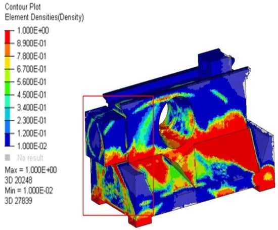 A comprehensive finite element model of the 5-axis machine tool is developed using the SolidWorks optimization tool, including detailed representations of all critical components, joints, and interfaces. The initial step involved designing the structural model’s appearance. Figure 3 shows the original structure of the machine tool. Then, SolidWorks is used to optimize the structure, identifying the best solution. The model part drawing is then adjusted according to the optimization results, as depicted in Figure 4. In the context of structural and topology optimization, a contour plot of element densities is a crucial tool. The design domain is discretized into finite elements, each assigned a density value from 0 (no material) to 1 (solid material), with intermediate values indicating partial material presence. The contour plot displays the spatial variation of these densities using contour lines or color gradients, making it easy to visualize material distribution. Such a plot helps identify optimal material layout, highlighting areas where material is needed and where it can be removed, thus guiding designers towards the most efficient structure. This optimization led to a 15% weight reduction compared to the original design. Additionally, the material remains unstressed, and significantly deformed areas are reinforced, enhancing the rigidity of the machine structure. Finally, the optimized model design is prepared Figure 5, and to address the problem, a 100 N force was applied to the center of the saddle.
