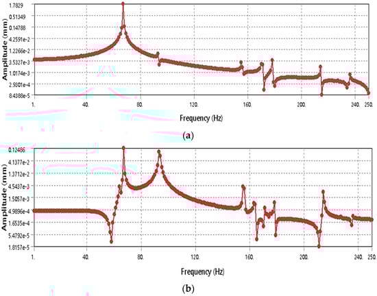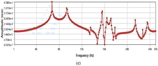Harmonic response analysis is employed to understand how a structure responds to sinusoidal excitation over a particular frequency range. This technique primarily investigates vibration phenomena induced via continuous frequency input and provides valuable insights into the structure’s behavior under such oscillatory stimuli [37]. To develop a virtual dynamic model and provide dynamic characteristics for machine tools, Wu et al. (2010) [38] suggested merging modal analysis, harmonic response, and FEA.