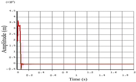 In the transient analysis, an impact force of 100 N was applied to the machine tool. The base of the machine tool was fixed to ensure stability during the test. The specific location of the impact point is illustrated in Figure 11. An extra cutting force was used for 0.05 s to replicate the cutting process. This cutting force induced a vibration response in the machine tool, which was observed and recorded over 2 s. The transient response of the system to the applied forces provided valuable insights into the dynamic behavior of the machining equipment. In Figure 12, the analysis enabled us to determine the amplitude of the tip point response in the X-axis direction. This information is crucial for understanding how the machine tool reacts to sudden forces and for identifying any potential issues related to vibrations that could affect machining accuracy and tool life. By analyzing the response amplitude, we can make informed decisions about necessary design modifications or adjustments to improve the machine’s performance and stability.