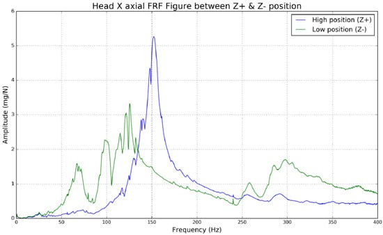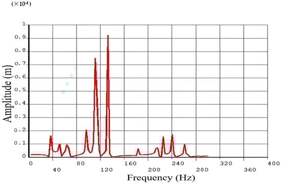 The response function X(s) can be derived from the structure’s transfer functions and the input force, even when the excitation (force) changes over time during a dynamic analysis. Beyond machine tool numerical techniques and modal studies, harmonic response analysis can provide a deeper understanding of dynamic characteristics. The machine tool’s behavior can be approximated using finite element analysis (FEA). If vibration modes and frequencies fall within a reasonable error range, this may be confirmed using frequency spectrum analysis. The responses of different frequencies are examined by subjecting the spinning cutting tool to an external force. For examination at frequencies ranging from 1 to 200 Hz, a 500 N force was applied to the cutting tool attached to the headstock spindle of the 5-axis machine in this experiment. Figure 10 displays the cutting tool’s X-, Y-, and Z-axis frequency responses based on the results.