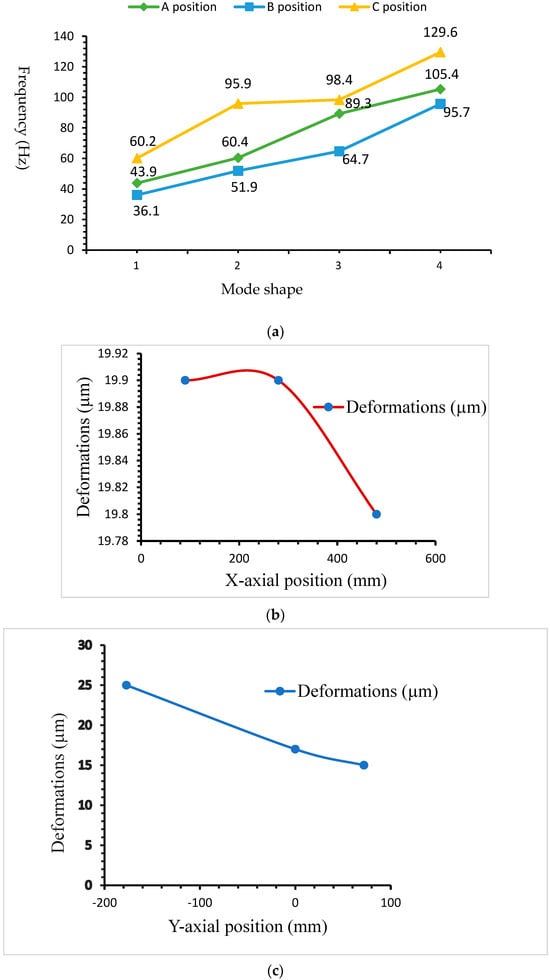 This study determines the frequency changes at three different locations. Position A is the leftmost end of X, the most forward point of Y, and the uppermost point of Z on the five-axis machine, and mode shapes are 43.9, 60.4, 89.3, and 105.4 Hz, as shown in Figure 14a. Position B is the center of X, the center of Y, and the center of Z, and intermediate mode shapes are 45.6, 70.5, 82.5, and 103.4 Hz, as shown in Figure 14b. Position C is the rightmost end of X, the rear end of Y, and the bottommost point of Z, and mode shapes are 60.2, 95.9, 98.4, and 129.6 Hz, as shown in Figure 14c. The machine modal frequency changes at different positions, as shown in Figure 15a.
