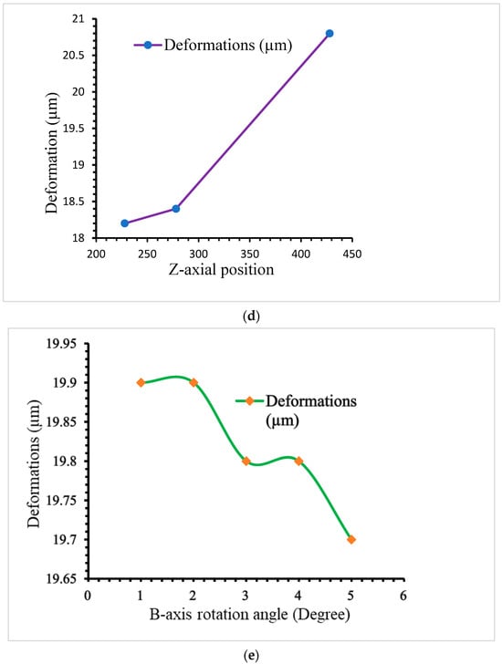 The quantity of space distortion is essentially constant at all angles since the machine’s center of gravity does not change much when the rotating shaft rotates. As a result, during cutting, the machine’s precision varies continuously. The rotary table is −30, 30, 45, 60, and 90°, and the variability is not substantially different, according to the data. As seen in Figure 15e, the difference is within 1 µm.