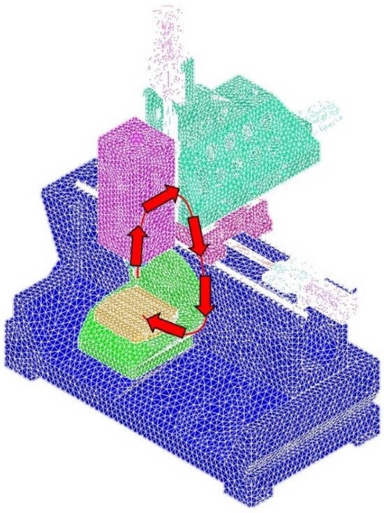 The machine is made up of numerous components, with a spring representing the interaction between the slider and the slide rail. The gravitational acceleration is set at 9.8 m/s2, and the spring stiffness is set at 1960 N/µm. The degree is calculated using a non-linear function. The use of tetrahedron Solid 187, patch-conforming algorithms, and quadratic element order significantly enhanced the accuracy of our mesh calculations. There are 713,791 elements and 1,101,810 nodes in the model. Figure 8 shows the FEM model of the vertical 5-axis milling machine.