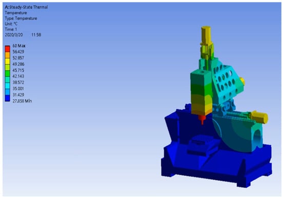 The principal aims of conducting a steady-state thermal analysis on a 5-axis vertical milling machine are as follows: ascertaining the temperature distribution throughout crucial components, including the spindle, tool holder, worktable, and drive motors; recognizing possible hot spots that may result in thermal distortion or component degradation; and optimizing the cooling and thermal management systems to guarantee optimal precision and dependable performance. We use the FEM model of the 5-axis machine tool in Ansys 19.2 to perform steady-state thermal analysis. Figure 18 presents the simulation which determines possible hot spots and computes the temperature distribution. The ambient temperature and the film coefficient are two significant elements in this investigation. Considering a film coefficient of 80 W/m2 °C and an ambient temperature of 60 °C, the thermal analysis of the spindle in a 5-axis vertical milling machine offers important insights into its thermal behavior. The spindle’s performance and dependability may be improved, guaranteeing accurate and effective machining operations, by comprehending and optimizing these temperature characteristics. This investigation highlights how crucial efficient heat management is for preserving the high-performance milling machines’ operational integrity.