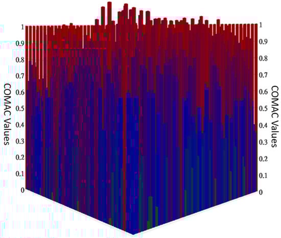 The Coordinate Modal Assurance Criterion (COMAC) is an expansion of the modal assurance criterion [42]. The COMAC looks for degrees of freedom in measurements that are adversely correlated with low MAC values. A collection of mode pairings, such as analytical versus analytical, experimental against experimental, or experimental versus analytical, are used to compute the COMAC. The set of mode pairs represents all modes of interest in a specific frequency range, but the two modal vectors in each mode pair represent the same modal vector. A value of COMAC will be calculated for each (measurement) degree of freedom for two sets of modes that are to be compared. We use ME’scope to perform the analysis, and one can better understand the results by seeing the COMAC matrix in Figure 23. The threshold analysis COMAC values close to 1 indicate high coherence, while values significantly less than 1 suggest inconsistencies or noise.