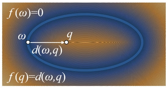 In the present study, two options can be used to define the domain, which comprise geometries generated with implicit functions by using ImplicitRegion[] and RegionPlot3D[] functions readily available in Mathematica, and geometries imported in a STL file format. Since the STL files are widely used for industrial and academic purposes, the focus here is kept on the latter option. Hence, the imported geometries are sliced with DiscretizeRegion[], a default Mathematica function, along the z-axis and a user-defined thickness value, e.g., between 0.1 mm and 0.2 mm, which are commonly used in the FFF method. As illustrated in the first step in Figure 1, the generated thin yet 3-D slices are then projected as 2-D polygons by means of the RegionPlot[] function. The polygon bounds are used to determine the reference contours (or isolines) comprising points with the assigned distance value of zero, . As illustrated in Figure 2, the signed distance function for any point q is calculated with respect to . To elaborate,