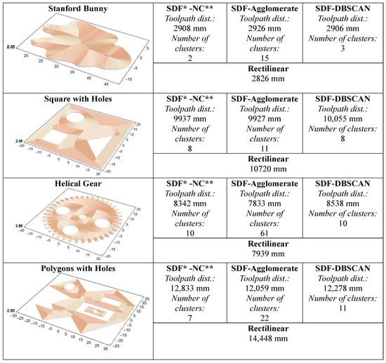 Generated toolpaths and number of clusters for various geometries by means of the current SDF−based and conventional rectilinear methods. The in−plane resolution was chosen to be 0.2 mm. SDF* and NC** refer to signed distance field and NC** refers to neighborhood contraction, respectively.