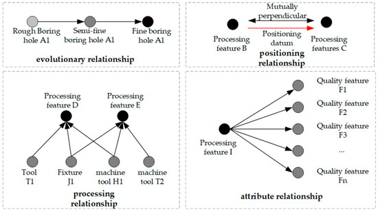 The error transfer network model for machining complex parts mainly includes nodes and edges. The network nodes are divided into machining feature nodes, quality feature nodes, and machining element nodes. The quality features depend on the machining features, reflecting the machining level, while the machining element nodes mainly input errors to the machining features. According to the evolution process of machining features in different stages during part machining, the positioning relationship between workpiece datums, the use of different machining elements, and the coupling relationship between machining features and their attached quality features, the connecting edges between the nodes are divided into four categories. These categories are evolution, positioning, machining, and attribute relationships [27]. The specific description of the edge relationships between nodes in the machining error transfer network is shown in Figure 1 below: