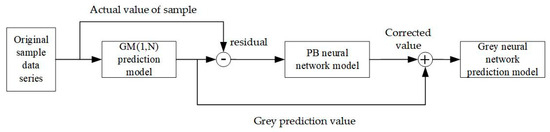 The grey neural network model is an organic combination of grey prediction and neural network modeling methods, which can solve complex uncertainty problems nonlinearly [32]. This paper uses the BP neural network to correct the residuals of the GM (1, N) prediction model and predict the residuals. The predicted values of the GM (1, N) prediction model are adjusted according to the residuals corrected by the BP neural network to improve the overall prediction accuracy.