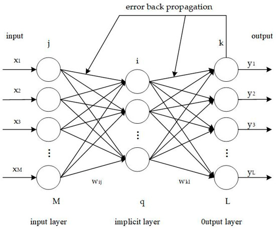 Considering that the processing examples and sample data selected in this paper have a small amount of computing power, and referring to the experience of related successful cases, this paper chose the three-layer neural network structure shown in Figure 4. The network consists of the input layer, hidden layer, and output layer. The complete training process includes two stages: forward propagation and backpropagation.