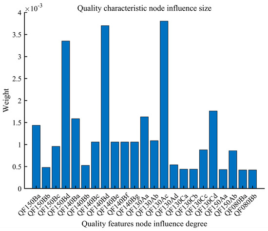 According to Figure 7, it can be seen that the influence degree of the quality feature nodes coded as QF130Ac, QF140Bd, QF150Bd, QF150Ba, QF130Cd, QF130Aa, QF140Ba, and QF150Ba is significantly higher than the other nodes. Among them, QF130Ac (fine boring of crankshaft bore size) has the highest influence degree, followed by QF140Bd (fine boring of camshaft bore size), QF150Bd (fine boring of cylinder bore size), QF130Cd (perpendicularity of end faces and crankshaft bores), QF130Aa (coaxial of crankshaft bores), QF140Ba (coaxial camshaft bores), and QF130Aa (verticality of cylinder bores). Therefore, these quality features are defined as critical quality features in the machining process of the diesel engine body.