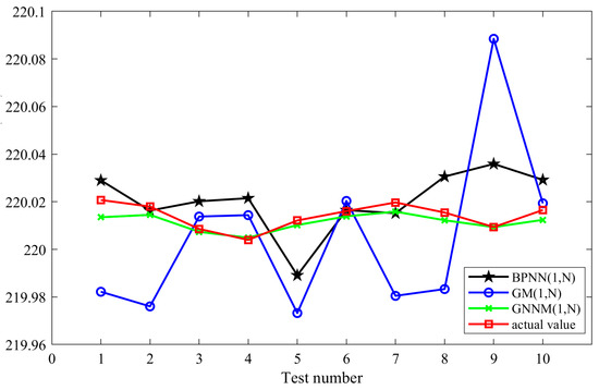 According to Figure 8, the optimized prediction model using neural networks is significantly better than the grey or BP neural network prediction models. Using the test set data for calculating the crankshaft bore size GNNM (1, N) prediction model , the value is . Therefore, the model meets the requirements for prediction accuracy and is highly reliable.