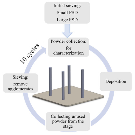 Schematic of the powder reuse process employed in this study for powders with small and large particle size distributions (PSDs).