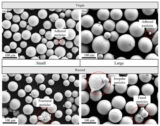SEM images of plasma-atomized Ti-6Al-4V powders in different conditions: (a) virgin–small, (b) virgin–large, (c) reused–small, and (d) reused–large.
