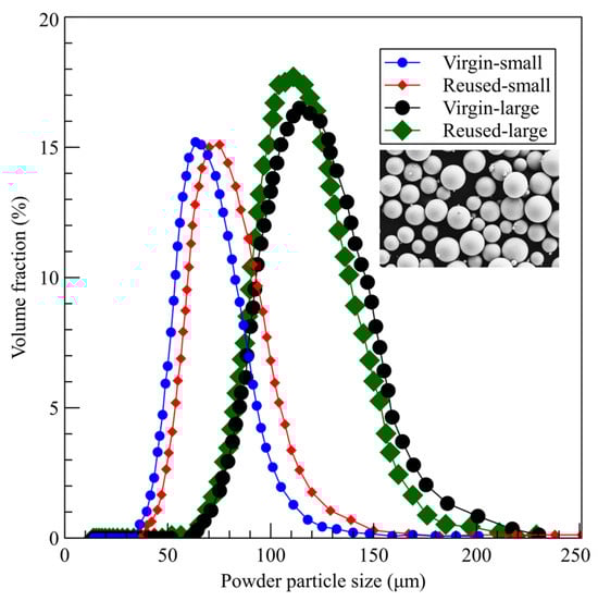 Figure 3 displays the PSDs of the small and large powders in their virgin and reused states. Analyses showed a slight increase in the PSD for the small powder and a slight decrease in the PSD for the large powder after reuse. This decrease in the PSD for the reused-large powder could be attributed to the agglomeration of large particles, which may have created particle sizes larger than 150 μm that were sieved out after each reuse cycle, leading to an overall decrease in the particle size. However, for the small powder, agglomerated particles may have still remained under 150 μm in size, which could explain the slight increase in larger size particles within this group.