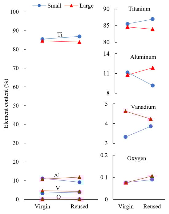 Figure 5 illustrates the elemental compositions of small and large powders in their virgin and reused states. The results revealed distinct trends in the elemental compositions of small and large particles resulting from the reuse process. Specifically, for the small powder group, reuse led to an increase in Ti and V contents, alongside a reduction in the Al content. Conversely, for large powder particles, powder reuse resulted in a decline in Ti and V contents while the Al content increased. Additionally, an increase in the oxygen content was observed in reused powders regardless of particle size. The relative standard deviation for the elemental composition measurements remained below 3%, indicating consistent results across the analyzed samples.