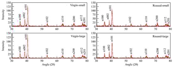 Figure 6 shows the XRD results of the small and large powder samples in their virgin and reuse states. All the samples displayed only peaks corresponding to the hexagonal close-packed (HCP) α/α′-Ti phases in the diffractograms. No peaks associated with the β phase, specifically the (200) peak at 57.7° and the (110) peak at 39.8°, were identified. The observations of this study indicated that no changes had occurred in the crystalline compositions of the powders due to the reuse process.