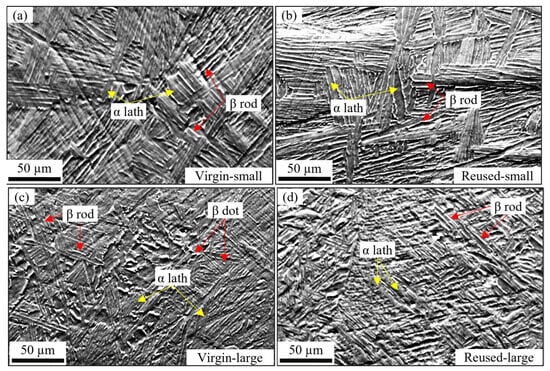 In this study, the microstructure of as-deposited samples mainly consisted of martensitic α′ phase. However, after post-fabrication annealing at 760 °C, the microstructure of Ti-6Al-4V became more homogenized and decomposed to a fine α + β microstructure, accompanied by grain growth and the coarsening of the α lath width [47,58]. Figure 7 shows the microstructure of the annealed samples fabricated via small and large powders in their virgin and reused states. Although this heat treatment process is known for the homogenization and partial decomposition of the Ti-6Al-4V alloy [59], some differences still could be observed in the microstructures of samples. As can be seen in Figure 7a–d, the morphologies and volume fractions of β rods, as well as the width of the α lath, changed significantly after powder reuse. Moreover, grain growth was observed for samples fabricated using both small and large powder particles as a result of powder reuse. A similar observation was reported by Joju et al. [60] following the reuse of Ti-6Al-4V powder through the DED-LB process. The PSD primarily influences phase morphologies, including variations in α lath thickness and width, as well as changes in the β phase, which can present as either dot or rod structures. After powder reuse, changes in the elemental composition—particularly in vanadium and oxygen—further contributed to microstructural variations. Oxygen, as an α stabilizer, promotes the formation of the α phase at grain boundaries and the β phase within the grains. In contrast, an increased vanadium content, acting as a β stabilizer, leads to a higher volume fraction of the β phase.