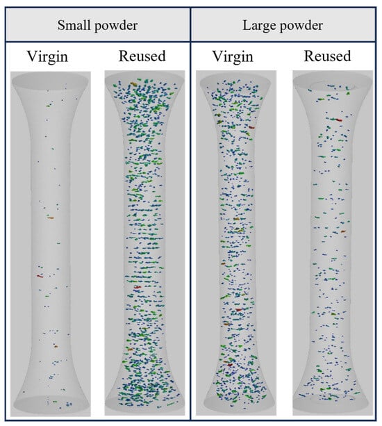 Defect data obtained from XCT imaging of the fatigue specimens in each category are provided in Table 3, and representative XCT imaging of the specimens in different conditions is provided in Figure 8. Overall, the results revealed that the defect formation within the specimens is significantly influenced by the PSD and reuse conditions. For specimens fabricated using powder in the virgin state, those fabricated using the large powder displayed higher numbers of defects than those fabricated with the small powder. In addition, the reuse of powder resulted in significant changes in the formation of defects. The specimens fabricated using reused-small powder showed a higher quantity of defects compared to those in the virgin state, with noticeable increases in both the number and total volume of defects. In contrast, for specimens fabricated using large particles, powder reuse led to a significant reduction in defect formation compared to what was noted in their virgin states.