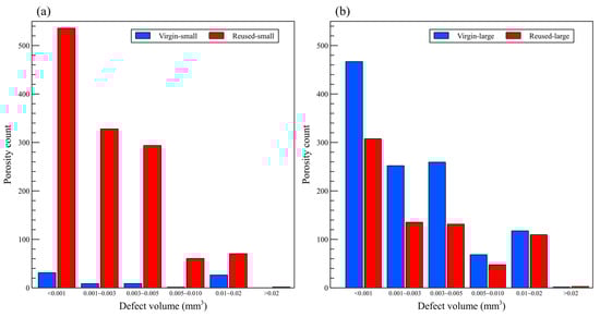 To better understand the volumetric distribution of defects within the specimens, the detected defects were classified into seven categories as shown in Figure 9. A significant increase in the number of defects was evident in specimens fabricated using the reused–small powder compared to those made from the virgin–small powder. However, for the specimens fabricated using large powders, an inverse trend was observed, with a significant reduction in the number of defects across all size classes following powder reuse. It is worth noting that for defects bigger than 0.01 mm3, there was no substantial change in the defect volume, as illustrated in Figure 9b.