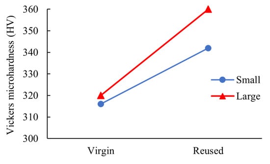 Figure 10 shows Vickers microhardness measurements for the specimens fabricated using different powder groups. As can be seen, the microhardness values in both conditions were almost equal before powder reuse, although the values for the sample fabricated using large powders were marginally higher than for those fabricated with small powders. With powder reuse, both conditions (i.e., virgin–small and virgin–large) exhibited an increasing trend in Vickers hardness values. The microhardness values for the reused–small sample increased by approximately 8% from 316 HV to 342 HV while the reused–large sample showed an increase of around 11% from 320 HV to 360 HV. The relative standard deviation for all hardness measurements was relatively small, remaining below 7% for all cases, indicating consistent measurements across the samples.