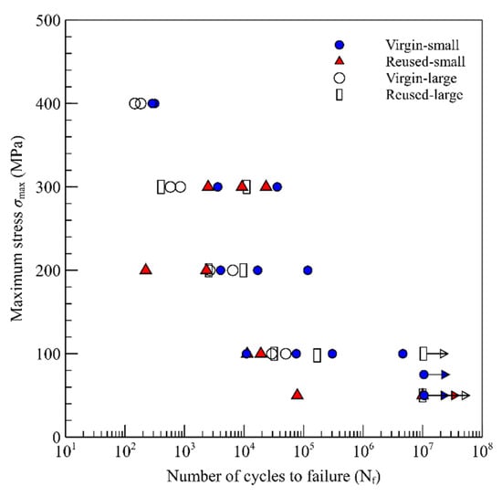The results of the uniaxial fully-reversed (R = −1) fatigue tests are illustrated in Figure 11, where the run-out specimens are indicated by arrows. Considering the scatter in the fatigue lives, no statistically significant differences were observed in the fatigue behavior of the specimens across different powder feedstock conditions: virgin–small, reused–small, virgin–large, and reused–large. However, for the sake of comparison, it can be noted that at higher stress levels (≥200 MPa), specimens fabricated via small powders showed slightly better fatigue resistance compared to the ones fabricated using the large powder. In addition, considering the effect of powder reuse, the virgin–small specimens demonstrated slightly better fatigue resistance than those fabricated using reused powder. This observation aligned with the XCT results, which revealed a higher number and volume of defects in the small–reused specimens compared to their virgin counterparts. The influence of powder reuse for the specimens fabricated using large powder particles was not pronounced. However, it could be observed that the reuse of powder increased the scatter of fatigue data for specimens fabricated using the large powder. The scatter in fatigue life could be attributed to the characteristics of defects (i.e., size and distribution), which significantly affect fatigue resistance. Process-induced defects (i.e., gas pores and LOF) can serve as localized stress concentrators, providing favorable sites for crack initiation under cyclic loading conditions. As a material undergoes repeated stress cycles, cracks initiating from these defect sites can propagate, progressively weakening the material and reaching premature failure. Hence, a rise in the formation of defects amplifies the probability of crack initiation, thereby increasing the uncertainty and potential for fatigue failure and consequently larger scatter in fatigue data.